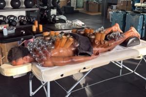 照片中的奧蓬達(dá)正在進(jìn)行拔罐,他從頸部到小腿全部安上了各種材質(zhì)的罐子。意大利媒體介紹稱,拔罐是一種可以緩解疼痛和放松肌肉的皮膚療法。