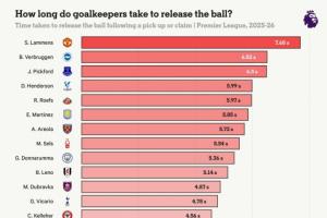 英超各隊門將平均拿球后抱球時間: