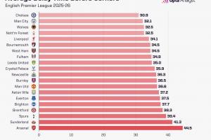 Opta統(tǒng)計2025/26賽季英超各隊角球前平均延誤時間(從少到多排序)↓