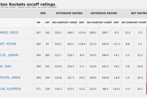注:on-off值統計的是在場凈效率與不在場凈效率的差值,本次統計要求至少打200分鐘。