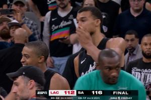 GIF-馬刺球員瘋狂慶祝中~!!!文班亞馬抱著福克斯有點淚目了~!!!