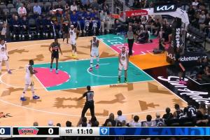 下半場換成了主色調(diào)淺藍色Curry12的球鞋
