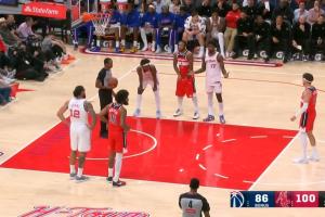 第三節32.2秒的罰球期間,現場能聽到亞當斯在怒斥伊森,聲音很大(現場錄像原聲清晰可聞)。伊森在對面站著攤手不解。