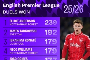 體育資訊3月9日訊 Squawka統計了本賽季球員在英超的對抗成功次數,并列出榜單,安德森是唯一對抗成功超過200次的球員。