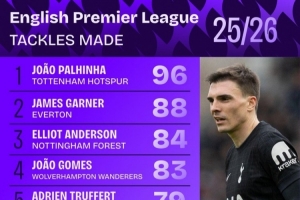 體育資訊3月9日訊 Squawka統(tǒng)計本賽季球員在英超的成功搶斷次數(shù),并列出榜單,帕利尼亞96次居首。