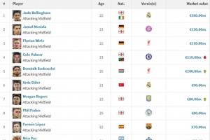 進攻型中場德轉身價排名: