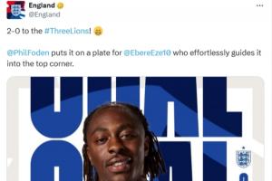 英格蘭官方在播報進球時寫道:“三獅軍團2-0領(lǐng)先!福登將球喂到嘴邊,埃澤毫不費力地將球送入上角?!?/p>