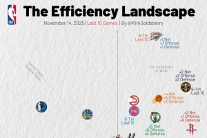 橫軸代表進攻效率,越靠右越好,縱軸代表防守效率,越靠上越強。第一象限的球隊多為發揮出色的球隊,而在第三象限的球隊通常為戰績比較糟糕的球隊。