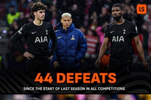 據LiveScore統計,上賽季以來熱刺各賽事輸掉44場比賽,與阿森納近5個賽季(2021年8月份以來)輸掉的比賽場次相同。
