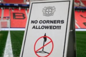 賽前勒沃庫森官推曾曬出球場角旗區的趣味標語牌(可能為AI生成):“禁止角球!!!”。