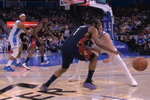 GIF-哈登持球被大瓦格納干擾出界,裁判吹魔術球權,騎士挑戰成功,拿回球權