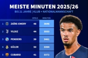 附五大聯賽U21球員出場時間榜: