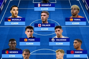 前鋒:穆西亞拉(拜仁,德國(guó),1.4億歐)、登貝萊(巴黎圣日耳曼,法國(guó),1億歐)、亞馬爾(巴薩,西班牙,2億歐)
