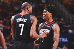 賽后火箭官方發布贏球海報,杜蘭特和阿門·湯普森成為封面人物。