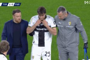比賽第5分鐘,帕爾馬中場克雷馬斯基出現(xiàn)傷情,在場邊接受治療左腿被纏上繃帶。