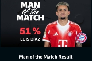 體育資訊3月15日訊 德甲第26輪,拜仁客場1-1戰平勒沃庫森,賽后拜仁邊鋒路易斯·迪亞斯51%得票率當選全場最佳球員。