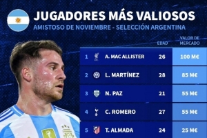 體育資訊11月15日訊 德國轉會市場統計了本期阿根廷隊名單的球員身價,麥卡利斯特1億歐居首,梅西1800萬歐排名第9位。