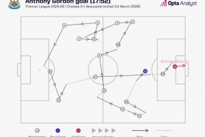 數(shù)據(jù)統(tǒng)計(jì)顯示,戈登的這粒進(jìn)球,紐卡斯?fàn)?1名球員中有10人參與其中,沃爾特馬德是在此期間唯一沒有觸球的球員。