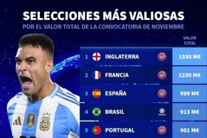 體育資訊11月15日訊 德國轉會市場統計了11月國際比賽日各國家隊的身價,并列出榜單,英格蘭、法國、西班牙前三,阿根廷排在第九位。