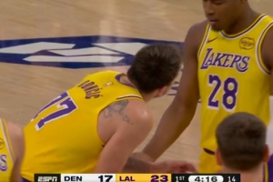 體育資訊3月15日訊 NBA常規(guī)賽,湖人對(duì)陣掘金。比賽中,東契奇保護(hù)籃板被八村打到要害。