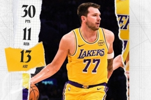 本場比賽,湖人球星東契奇首發出戰43分鐘,投籃26中10,三分球14中4,罰球9中6,拿下30分11籃板13助攻1搶斷3蓋帽的數據。