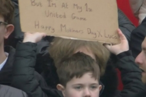 比賽現場看臺有一位可愛的小球迷高舉紙牌,上面寫道:“對不起媽媽,但是今天是我第一次來到現場看曼聯比賽,祝您母親節快樂!”