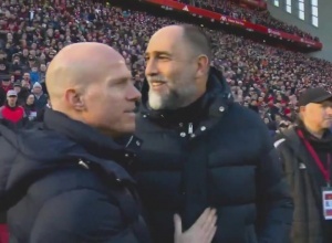 轉(zhuǎn)播鏡頭顯示,比賽開(kāi)始前,圖多爾出現(xiàn)在安菲爾德場(chǎng)邊,他走向一個(gè)穿著深色外套,雙臂交叉的人面前,拍了拍他的肩膀,打招呼并與他握手——可能認(rèn)為對(duì)方是斯洛特。