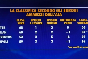 體育資訊3月16日訊 記者Fabio Ravezzani社媒列出了意甲無誤判情況下的前四名積分榜,國米仍積68分居首,米蘭、尤文積59分次席。