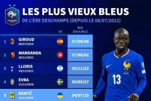 體育資訊11月15日訊 世預(yù)賽歐洲區(qū)比賽,坎特踢滿全場(chǎng),幫助法國(guó)主場(chǎng)4-0擊敗烏克蘭,德轉(zhuǎn)列出了德尚執(zhí)教法國(guó)隊(duì)以來(lái)年齡最大出場(chǎng)球員排名,吉魯居首,坎特排在第5位。