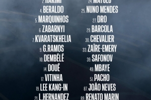前鋒:7-克瓦拉茨赫利亞、9-貢薩洛·拉莫斯、10-登貝萊、14-杜埃、29-巴爾科拉、49-姆巴耶