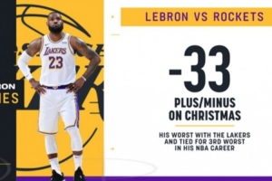 ESPN曬出數據顯示,圣誕大戰打火箭-33的正負值是詹姆斯湖人生涯最差,也平了其個人生涯第三差。