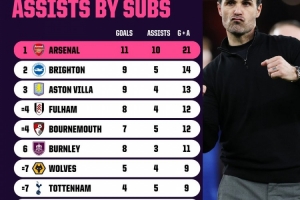 體育資訊3月17日訊 Opta統(tǒng)計了2025/26賽季英超聯(lián)賽中,各隊替補球員貢獻(xiàn)的進(jìn)球和助攻數(shù)據(jù),阿森納位列第一。