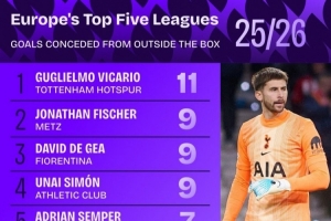 體育資訊3月17日訊 Squawka統計了本賽季門將在五大聯賽禁區外失球的數量,并列出榜單,維卡里奧11球最多。