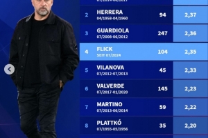 體育資訊3月17日訊 德國轉會市場盤點了巴薩歷任主教練場均拿分情況(至少執教15場比賽),弗里克以2.35分位居第4,僅次于恩里克、埃雷拉和瓜迪奧拉。