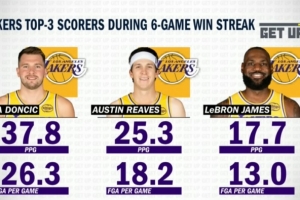 里夫斯6連勝期間場均出手18.2次,場均砍25.3分