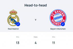 皇馬與拜仁在歐冠歷史上交手過28次,皇馬13勝4平11負占據上風,皇馬歷史上15次獲得歐冠冠軍,排列第一;拜仁6次奪冠,排名第三。