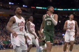 GIF-雄鹿不敵騎士,比賽中烏斯曼·吉昂在米切爾面前使用后者招牌海底撈大回環,結果脫手出界,米切爾看笑了!