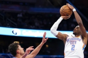今天雷霆對魔術(shù)最后一節(jié)99比96膠著時,亞歷山大一個單挑撤步三分,擊倒班凱羅。