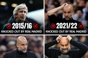 曼城在歐冠淘汰賽與皇馬交手7次,被淘汰5次。