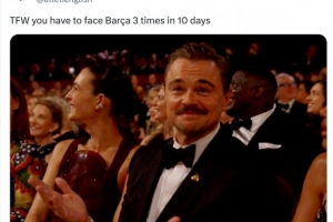 這意味著馬競將在10天內3次對陣巴薩,馬競官方社媒曬出萊昂納多·迪卡普里奧在奧斯卡頒獎典禮上一臉無奈的照片,配文:“當你不得不在10天內3次對陣巴薩時的感受。”