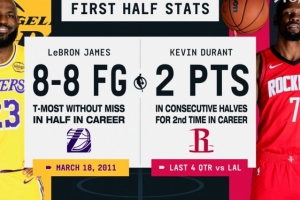 上半場詹姆斯8中8砍下18分,杜蘭特3中1僅得2分
