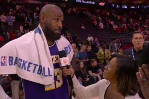 賽后,詹姆斯在場邊接受了記者(Lisa Salters)采訪。他說道:“我本來要立刻回更衣室冰敷(手肘),但我愛你,你太棒了, 我必須回來接受你的采訪?!?/p>