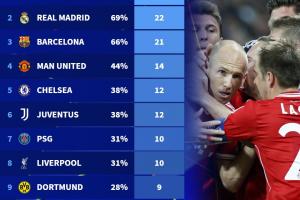 體育資訊03月19日訊 歐冠八強已經(jīng)全部產(chǎn)生,德轉(zhuǎn)統(tǒng)計了各球隊自1994/95賽季起參加歐冠1/4決賽的次數(shù),其中,拜仁、皇馬、巴薩位居前三,曼聯(lián)第四。