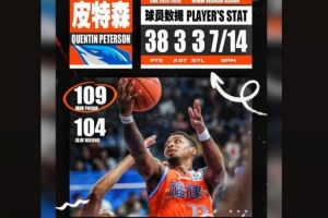 本場比賽,福建外援皮特森表現出色,進攻端勢不可擋,外線神準的同時殺傷力也很強,最后時刻連續五罰全部命中,首發出戰30分鐘,投籃23中10,三分球14中7,罰球13中11,砍下38分3籃板3助攻3搶斷的數據,正負值+12。