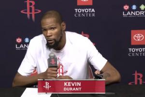 賽后,杜蘭特參加新聞發布會,接受了記者的采訪。