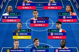 中場(chǎng):恩梅查(5000萬(wàn)歐)、帕夫洛維奇(7500萬(wàn)歐)、揚(yáng)·迪奧曼德(7500萬(wàn)歐)、穆西亞拉(1.2億歐)、奧利塞(1.4億歐)