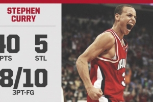 本場比賽,當(dāng)時效力于戴維森學(xué)院的庫里出戰(zhàn)39分鐘,22投14中,三分球10中8、罰球6中4,砍下40分3籃板2助攻5搶斷,其中下半場則是貢獻(xiàn)30分。