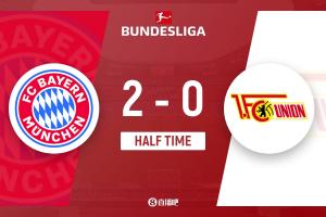 上半場傷停補時1分鐘,半場結束,拜仁暫2-0柏林聯合。