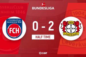 上半場比賽結束,海登海姆0-2勒沃庫森。