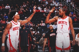 賽后火箭官推發布贏球海報,封面是阿門和杜蘭特擊掌瞬間。